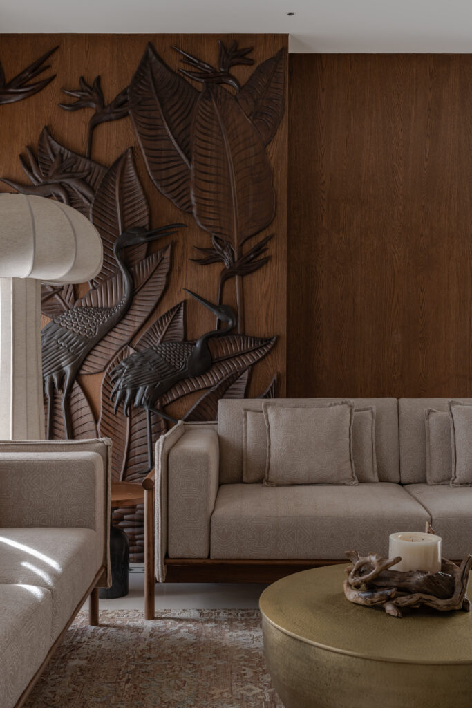 The residence features warm wood tones, woven cane accents, natural stone surfaces, and custom-crafted furniture, creating an atmosphere of understated luxury. Generous openings frame the landscape, allowing natural light to soften the interiors throughout the day. Curated art pieces, artisanal lighting, and locally inspired décor further enhance the home’s narrative of calm, comfort, and cultural richness.